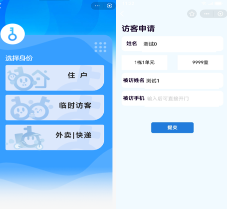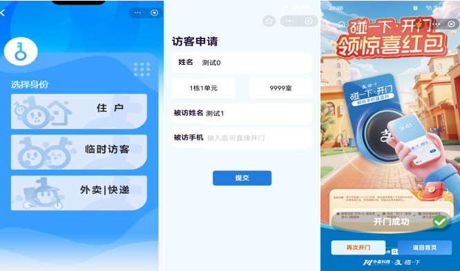 方式1:彈出界面選擇需要到訪的房間號+姓名提交,對應(yīng)的房主就會(huì)收到開門提醒通知,并點(diǎn)擊一鍵開門!您就可以進(jìn)入!
