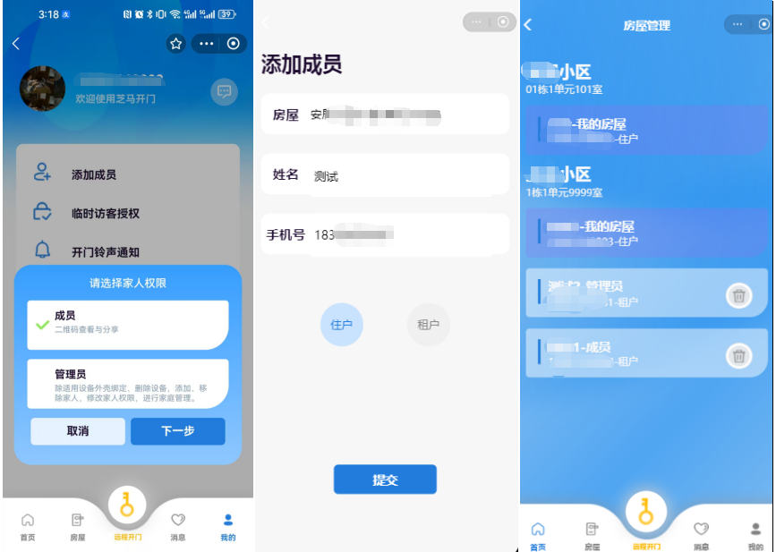 管理員住戶直接打開支付寶(芝馬開門)小程序,在個(gè)人中心選擇添加成員,輸入姓名和手機(jī)號。成員即可碰一碰開門。(注意添加成員權(quán)限必須為管理員權(quán)限,普通住戶申請管理員需聯(lián)系物業(yè))
